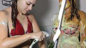 After playing a fun card draw game with Monica, Diana goes for a well deserved shower. She soaked her clothes to remove all the messiness, but to leave her dress tight. She pours and pours water endlessly. Starring: | ||||